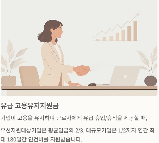 - 유급: 평균임금의 70% 이상을 지급 → 그 중 일부를 정부가 지원