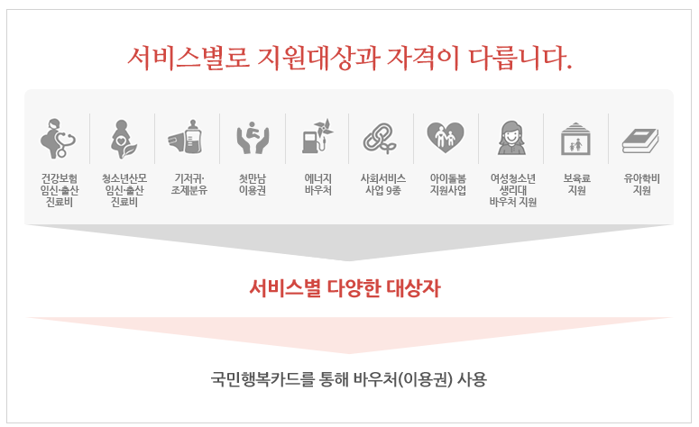 - 국민행복카드는 정부의 여러 복지 바우처를 한 장의 카드로 통합