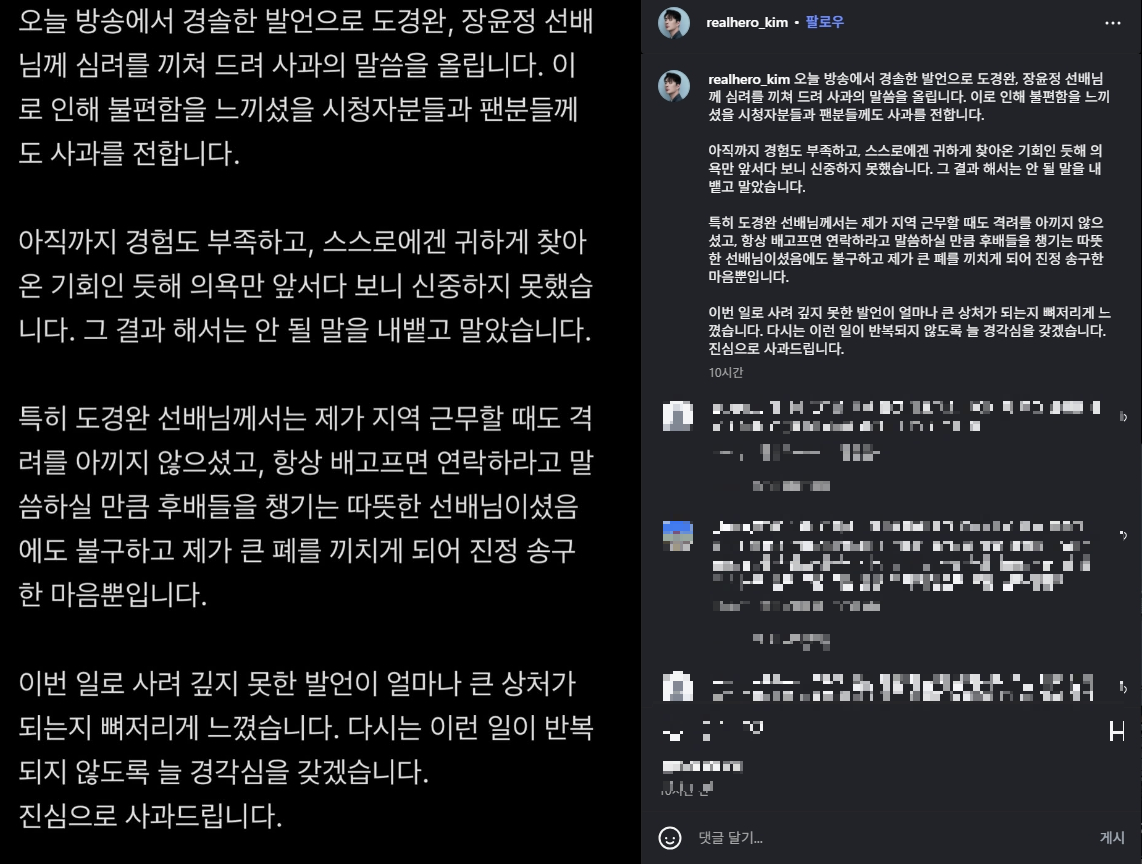 그는 “방송에서 경솔한 발언으로 도경완 선배님과 장윤정 선배님, 그리고 시청자 여러분께 심려를 끼쳐 진심으로 사과드립니다”라며 시작해,