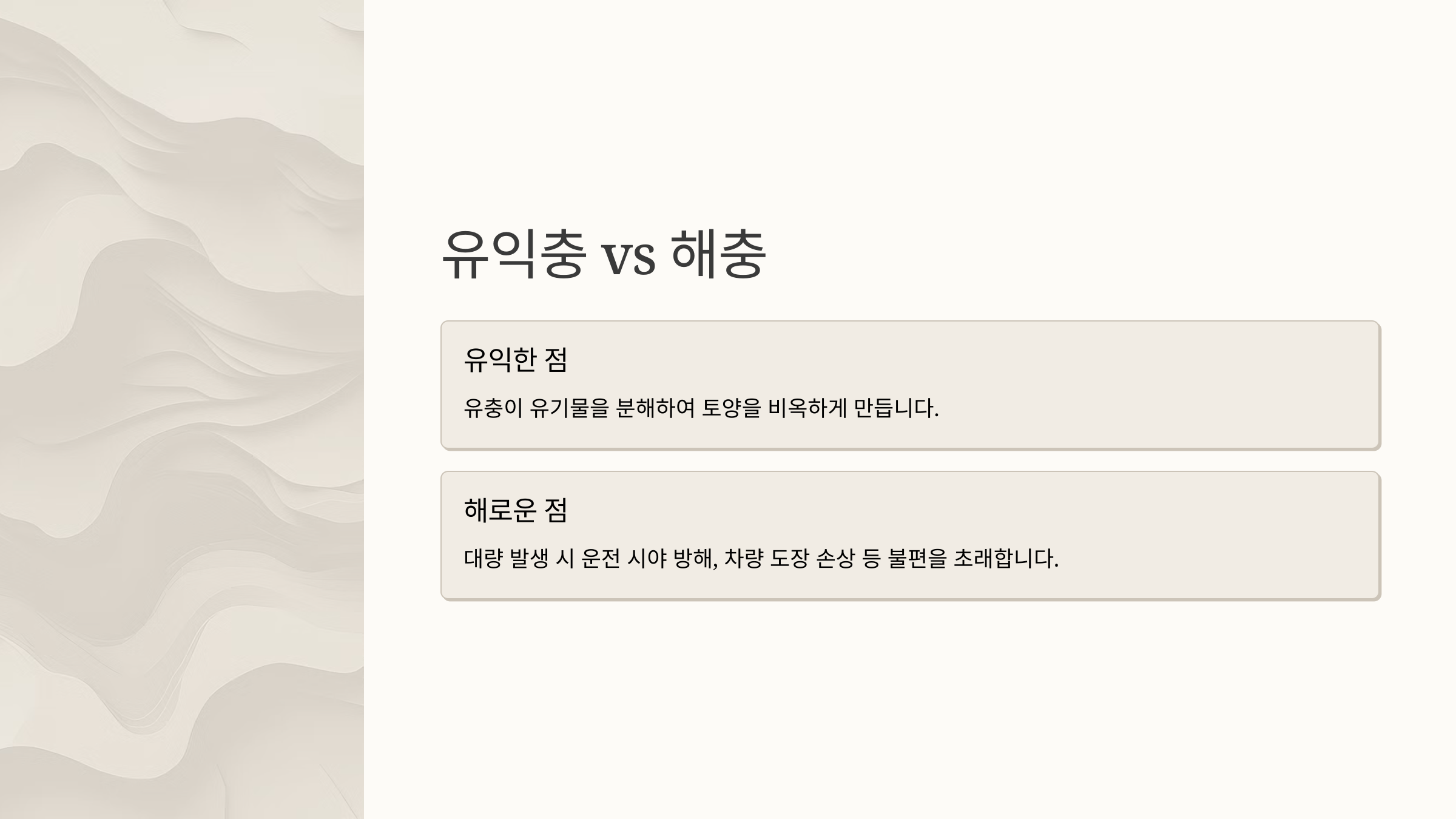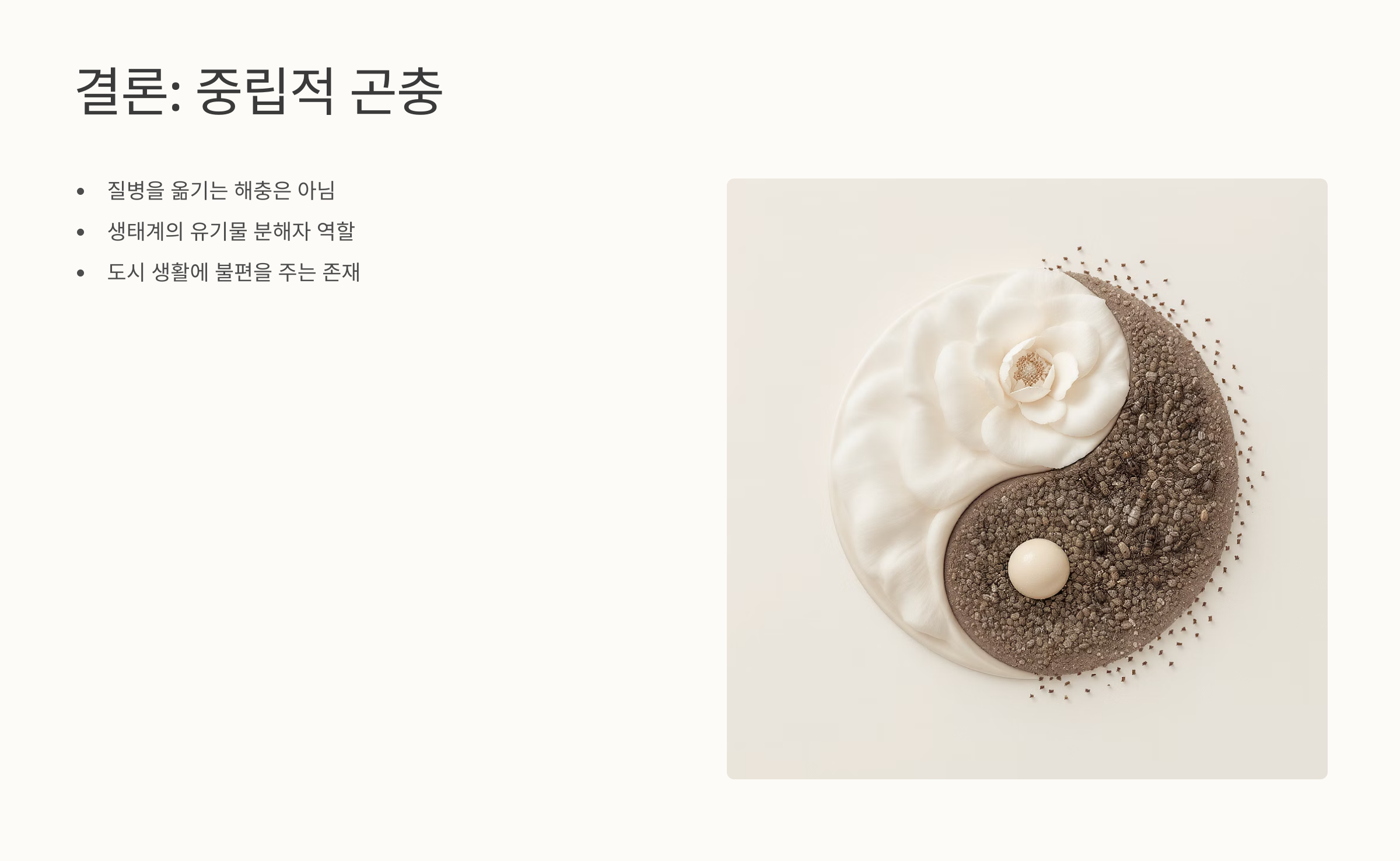 종합적으로 보면, 러브버그는 농작물에 해를 주거나 질병을 옮기는 해충은 아닙니다. 오히려 토양 건강에 기여하는 유기물 분해자로서 일정 부분 유익한 생태적 역할을 수행합니다. 하지만 도시 생활 속에서 발생하는 불편과 피해 때문에 많은 사람들에게는 해충처럼 여겨지기도 합니다. 따라서 러브버그는 생태적으로는 유익하나, 생활 측면에서는 불편을 유발할 수 있는 중립적 곤충이라고 볼 수 있습니다.