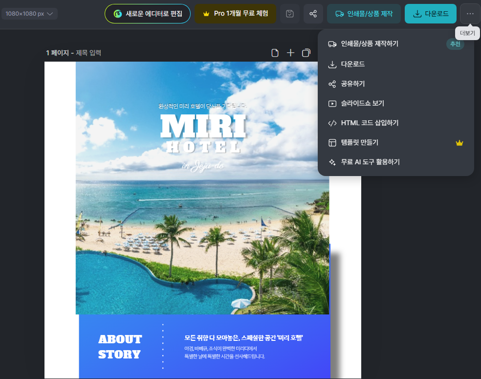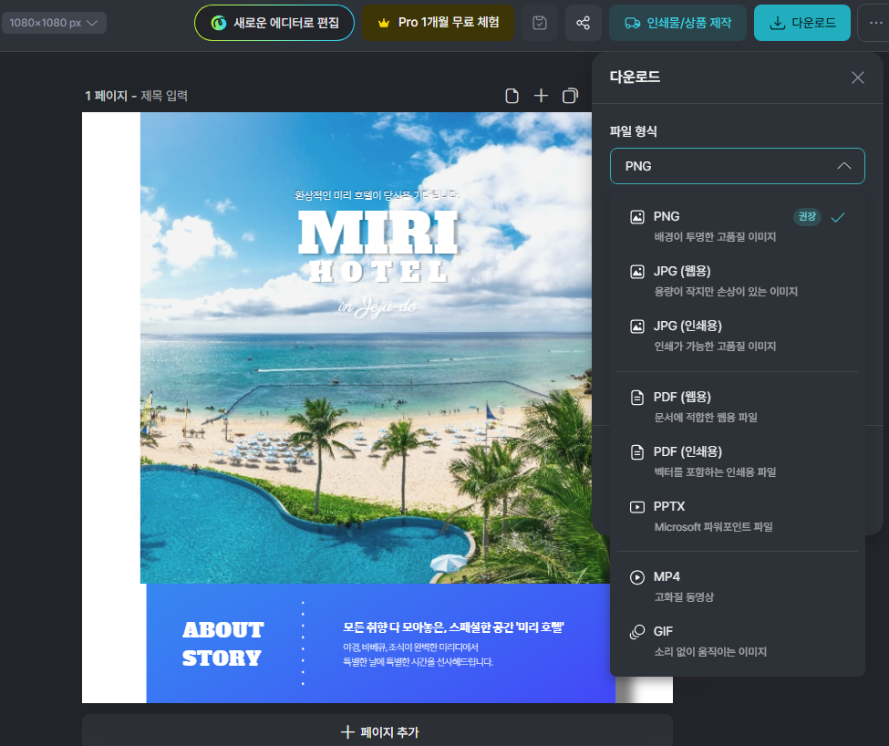 - 다운로드 포맷: PNG, JPG, PDF, PPT, GIF, MP4 등
