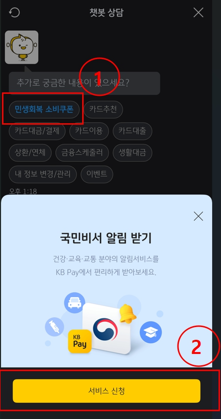 - KBpay 앱 설정 → 챗봇 →하단 알림 서비스 신청→민생회복소비쿠폰 서비스신청→ 신규체크 후 확인