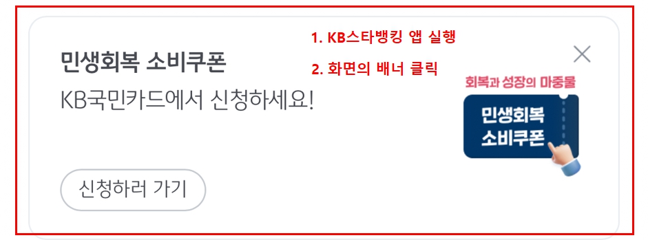 - 또는 KB국민은행(KB스타뱅킹 앱 ) → ‘ **민생회복소비쿠폰 배너 ’ 클릭 확인**