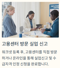 - 고용센터 방문 실업 신고: 실업신고 + 수급자격 인정 신청 (방문 or 온라인)