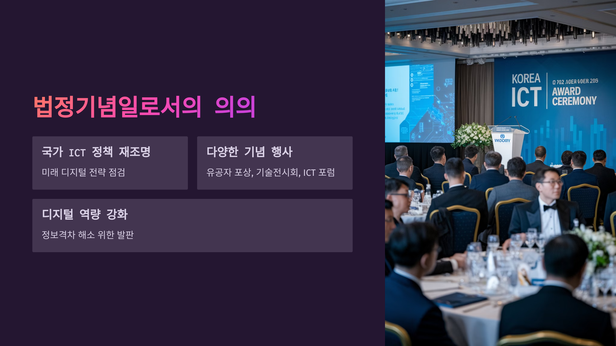 4차 산업혁명의 키워드는 ‘초연결, 초지능, 자동화’입니다. 이 모든 기술적 기반에는 ICT가 존재하죠. 자율주행차, 스마트팩토리, 디지털 헬스케어 등도 모두 정보통신 기술과 깊은 연관이 있어요. 정보통신의 날은 이러한 기술 진보를 대중에게 소개하고, 국민 모두가 미래 디지털 사회의 주체가 되도록 돕는 계기가 됩니다. 학생부터 어르신까지 모두가 ‘디지털 시민’으로 성장할 수 있도록 다양한 교육 프로그램도 이 날을 기점으로 확대되고 있습니다.