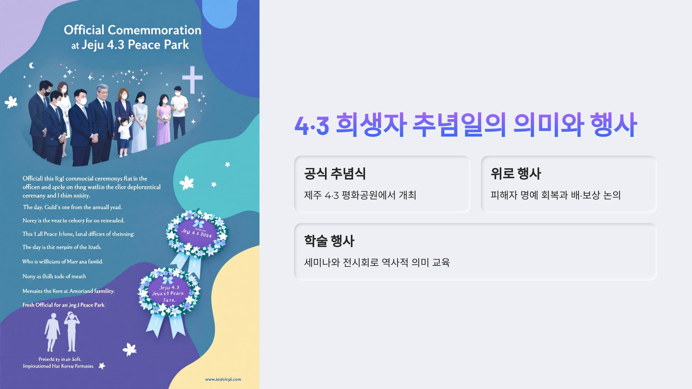 - 제주 4·3 사건의 역사적 의미를 알리고, 후손들에게 평화와 인권의 중요성을 교육하는 행사들이 진행됩니다.