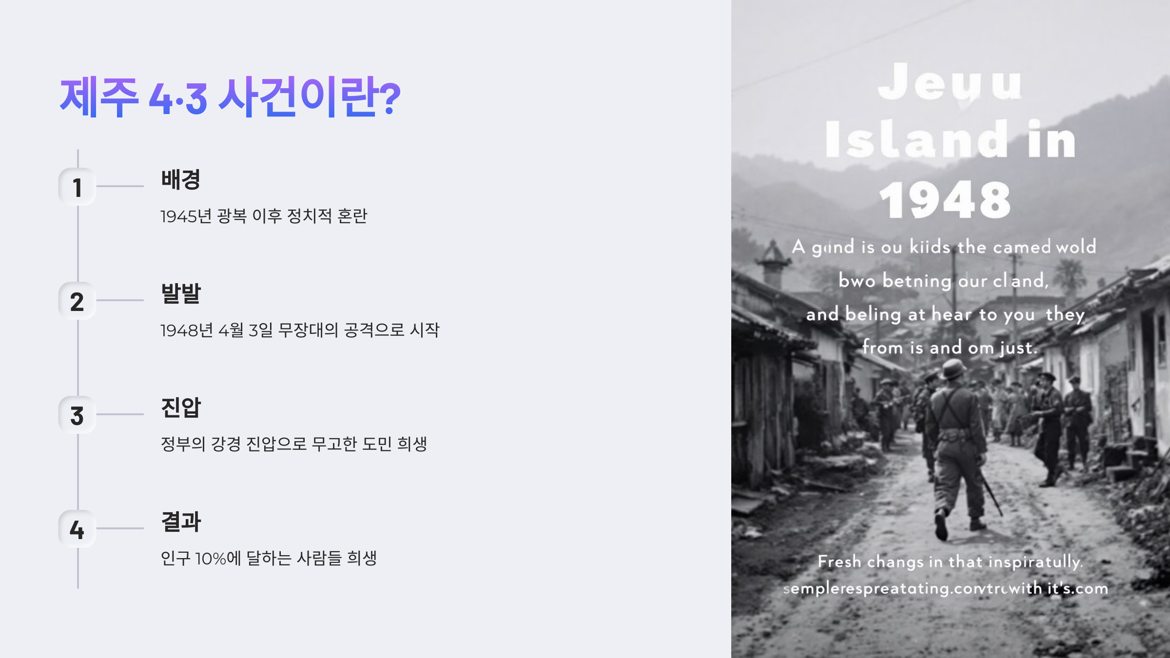 - 결과: 제주도 전체 인구(약 30만 명)의 10%에 달하는 사람들이 희생되었으며, 많은 사람들이 생존을 위해 섬을 떠나야 했습니다.