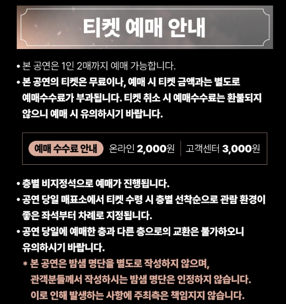 - 현장 선착순 배정: 공연 당일 매표소에서 티켓 수령 시 앞줄부터 배정