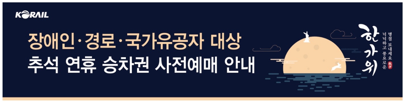 | 국가유공자 | 9월 2일(화) | 15:00~ | 철도고객센터 전화 예매 | 호남, 전라, 강릉, 장항, 중앙, 영동, 태백 등 |