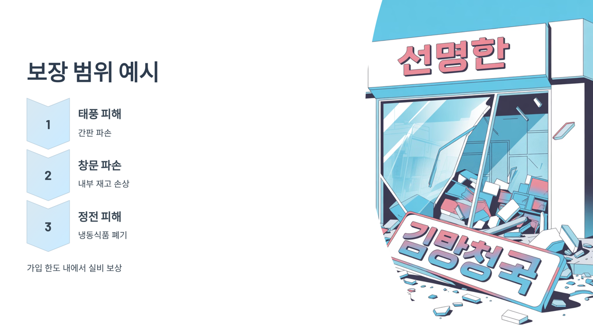 해당 보험은 자연재해 발생 시(판이 떨어지거나, 유리창이 깨지거나, 내부 재고가 망가졌을 때 )