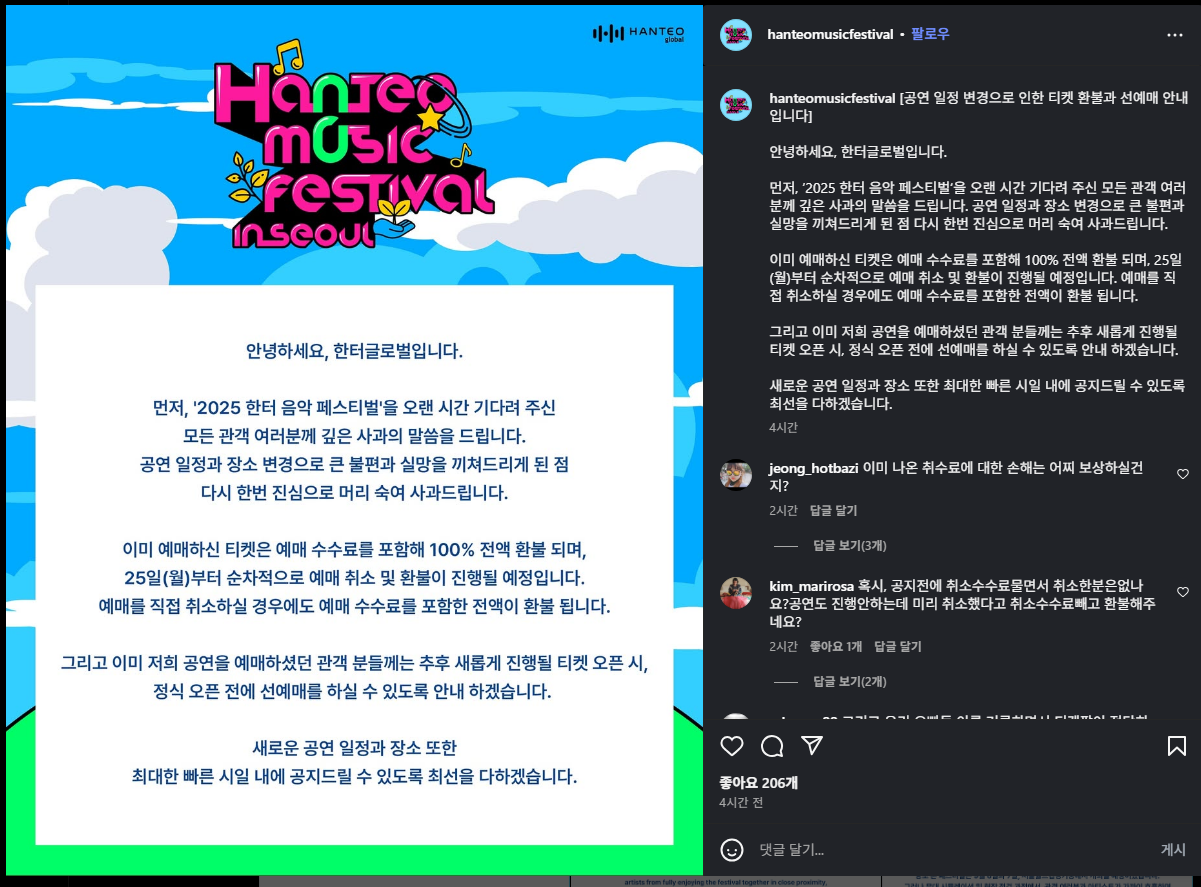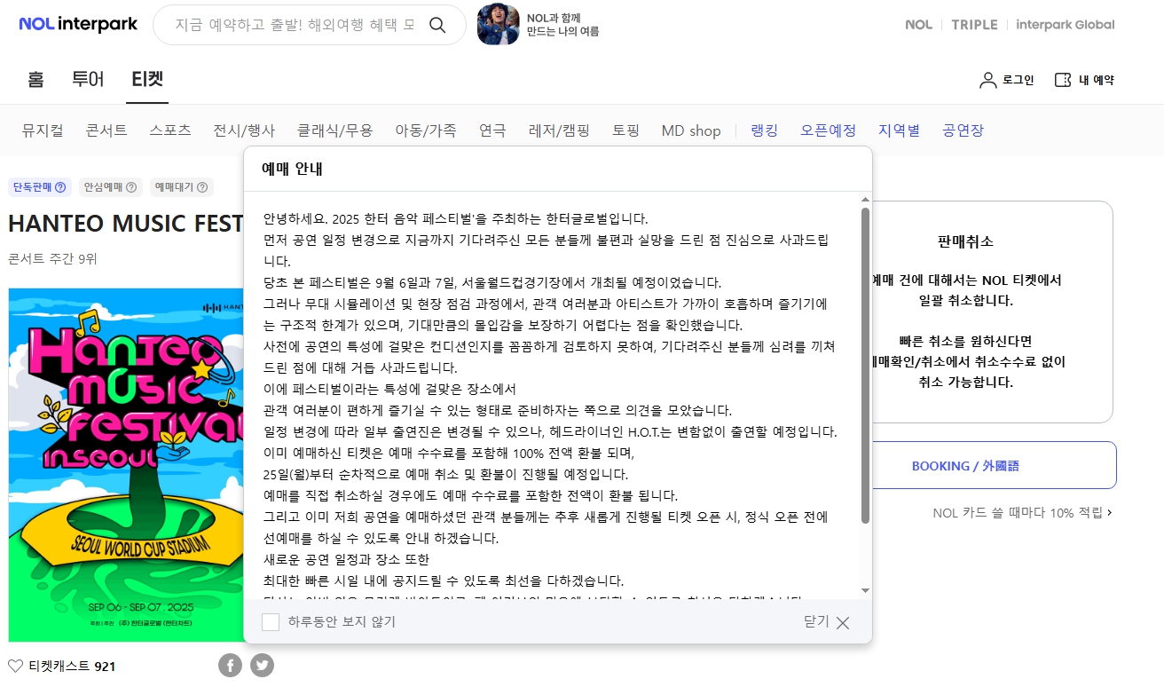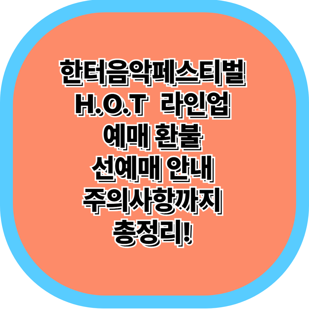 2025 한터음악페스티벌의 공연 장소 변경 및 일정 연기! 예매는 종료되었지만 H.O.T 완전체 출연은 그대로 확정. 전액 환불 진행 중이며, 재예매 및 선예매 정보, 라인업 구성과 불법 티켓 거래 주의사항까지 완벽 정리했습니다.