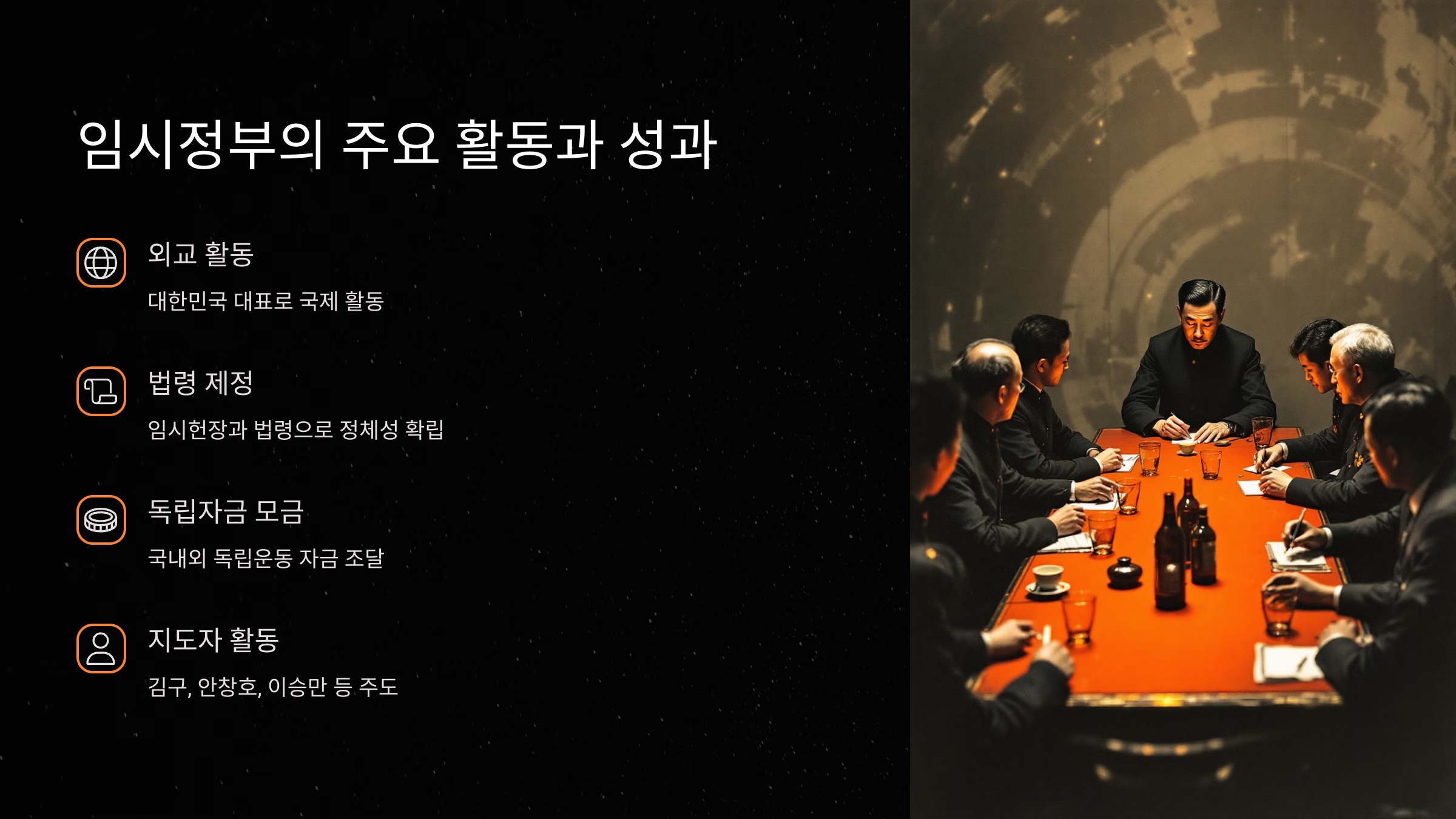 임시정부는 단순한 상징적 존재를 넘어서 다양한 분야에서 실질적인 활동을 벌였습니다. 대한민국의 외교를 책임졌고, 임시헌장과 법령을 만들어 정체성을 확립했습니다. 또 국내외에 독립운동 자금을 모으고, 광복군 창설을 주도하며 무장 투쟁도 이어갔습니다. 특히 김구 선생과 안창호, 이승만 등의 지도자들이 중심이 되어 국민과 함께 나라를 지켜냈습니다.