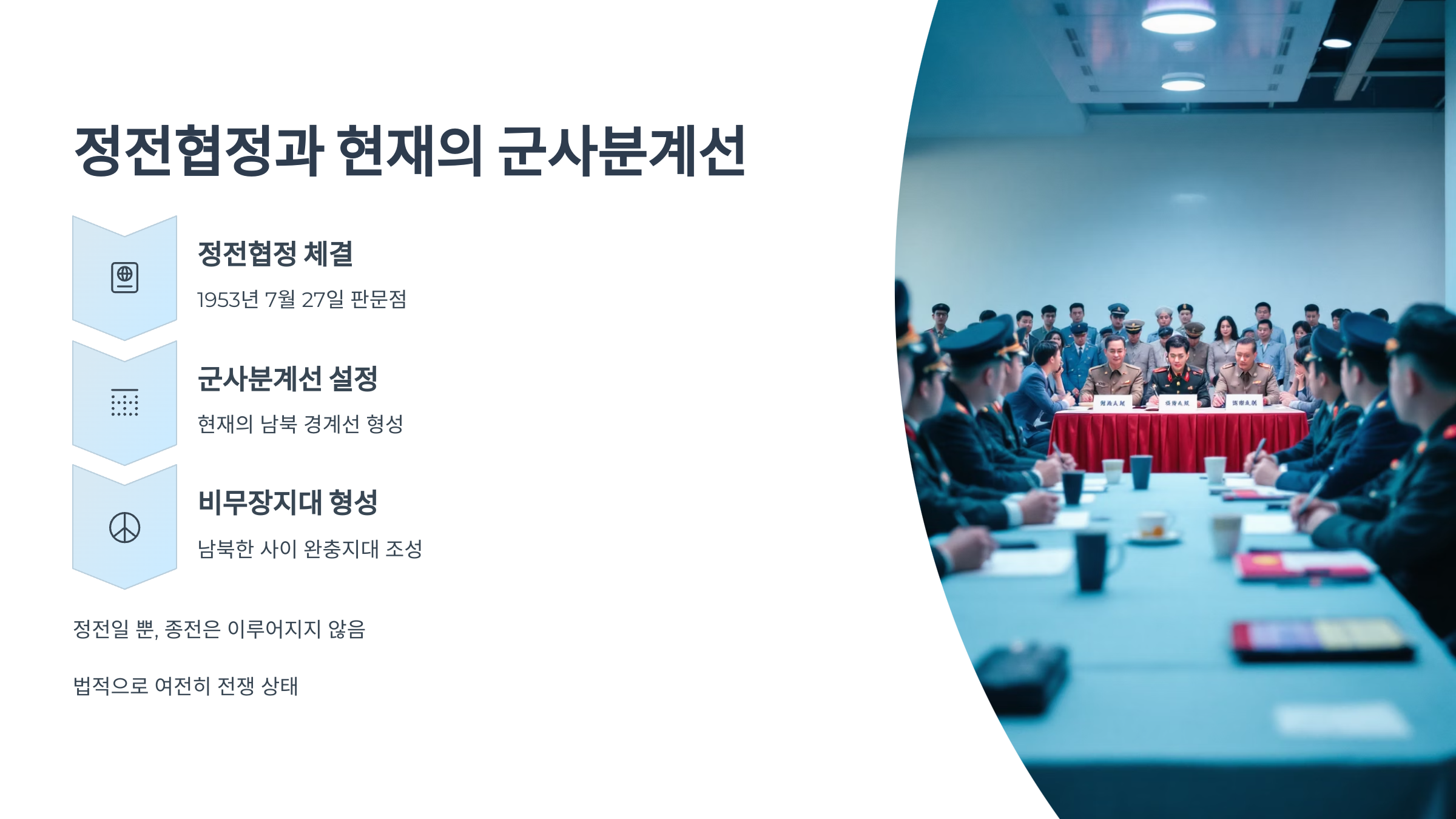 1953년 7월 27일, 판문점에서 정전협정이 체결되며 전쟁은 일단락됩니다. 다만 정전일 뿐, 종전(전쟁의 공식 종료)은 이루어지지 않아 현재까지 남북은 법적으로 전쟁 상태로 남아 있습니다.
