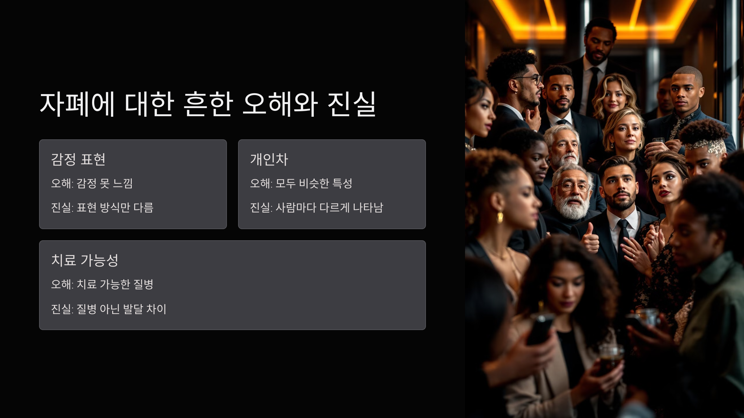 자폐는 특별한 질병이 아니라, 신경 발달의 차이일 뿐이에요. 다양한 방식으로 세상을 경험하고 소통하는 자폐인을 이해하는 것이 가장 중요한 목표랍니다.