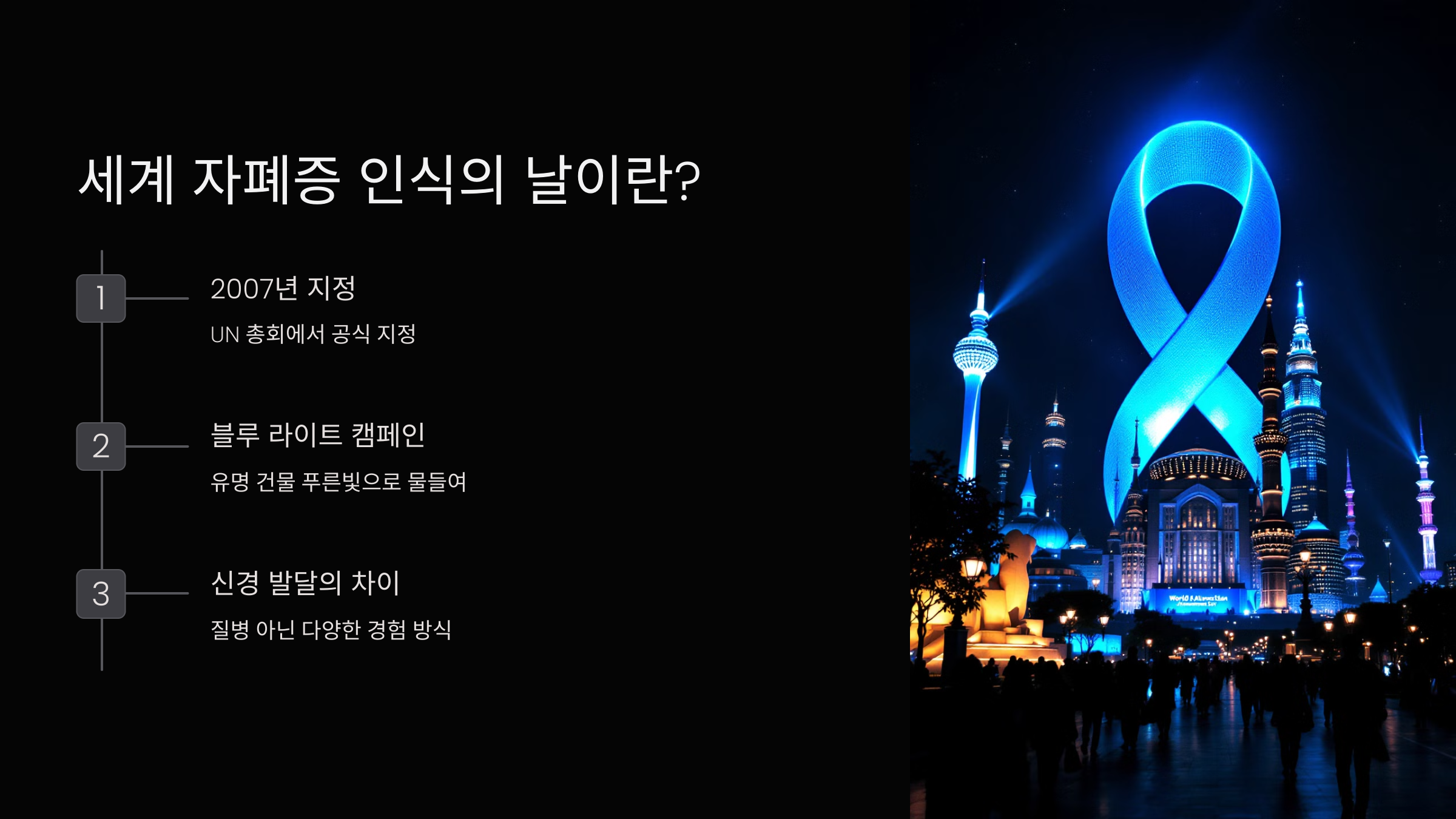 세계 자폐증 인식의 날(World Autism Awareness Day)은 2007년 UN 총회에서 공식 지정한 날로, 자폐 스펙트럼 장애(ASD)에 대한 인식을 높이고 자폐인의 권리를 보호하기 위해 만들어졌어요. 이 날을 맞아 세계 곳곳에서는 "Light It Up Blue(블루 라이트 캠페인)"라는 행사가 열리며, 유명 건물과 랜드마크가 푸른빛으로 물들죠.