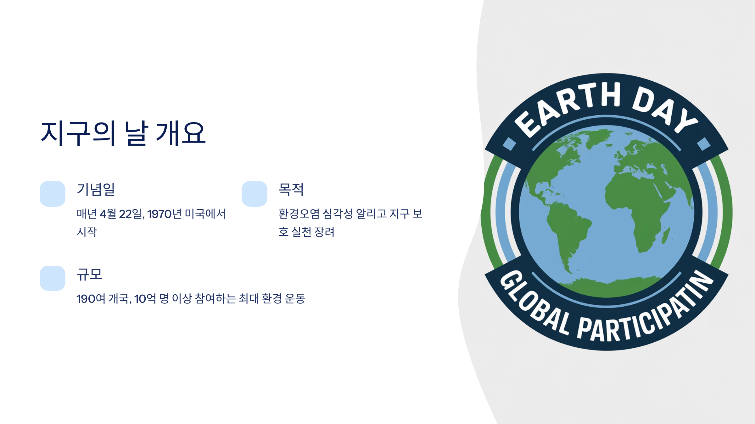 지구의 날(Earth Day)은 전 세계적으로 환경보호의 중요성을 알리고, 기후변화 대응과 생태계 보존을 위한 실천을 다짐하는 국제적인 기념일입니다. 매년 4월 22일, 전 세계 수억 명이 다양한 방식으로 환경을 생각하고 행동하는 이 날은 지구를 위한 ‘전 인류의 약속의 날’이기도 합니다.