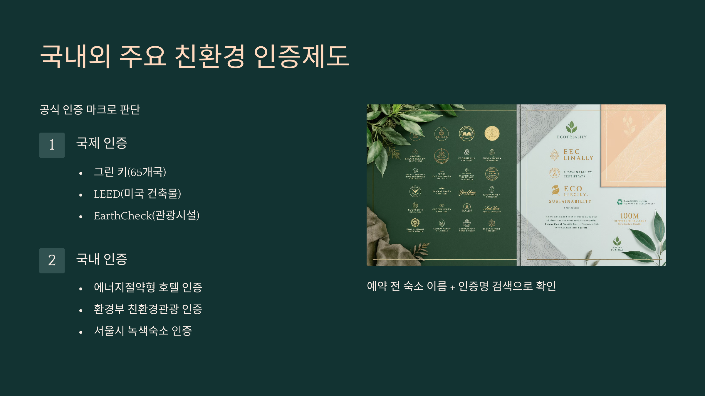 📜 신뢰할 수 있는 공식 인증 마크가 친환경 숙소를 판단하는 기준이 될 수 있어요.