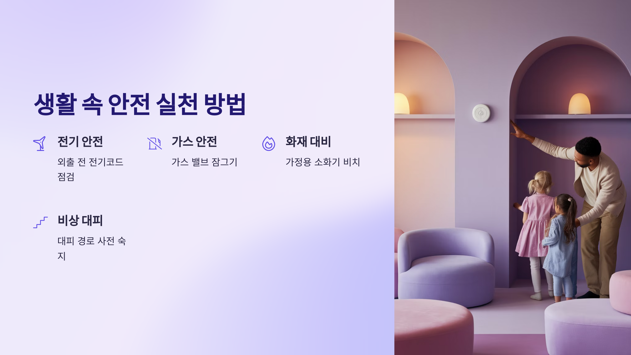 가스 점검, 전기 안전 관리, 정기적인 소화기 점검, 대피로 확인 등 일상에서 충분히 실천할 수 있습니다.