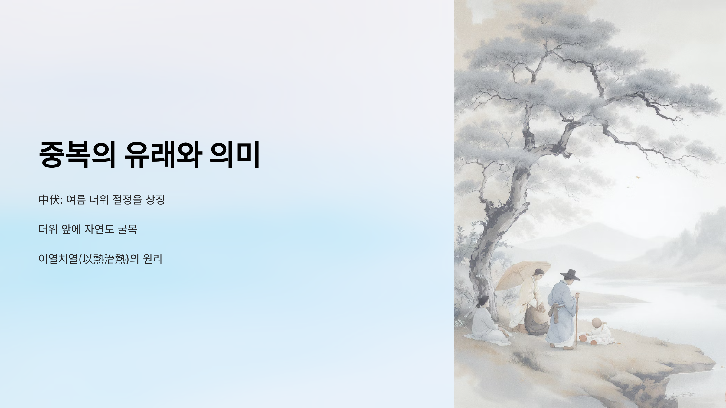 ‘중복’은 한자로 ‘가운데 중(中)’과 ‘엎드릴 복(伏)’을 써서, 여름 더위가 절정에 이르렀음을 상징합니다.