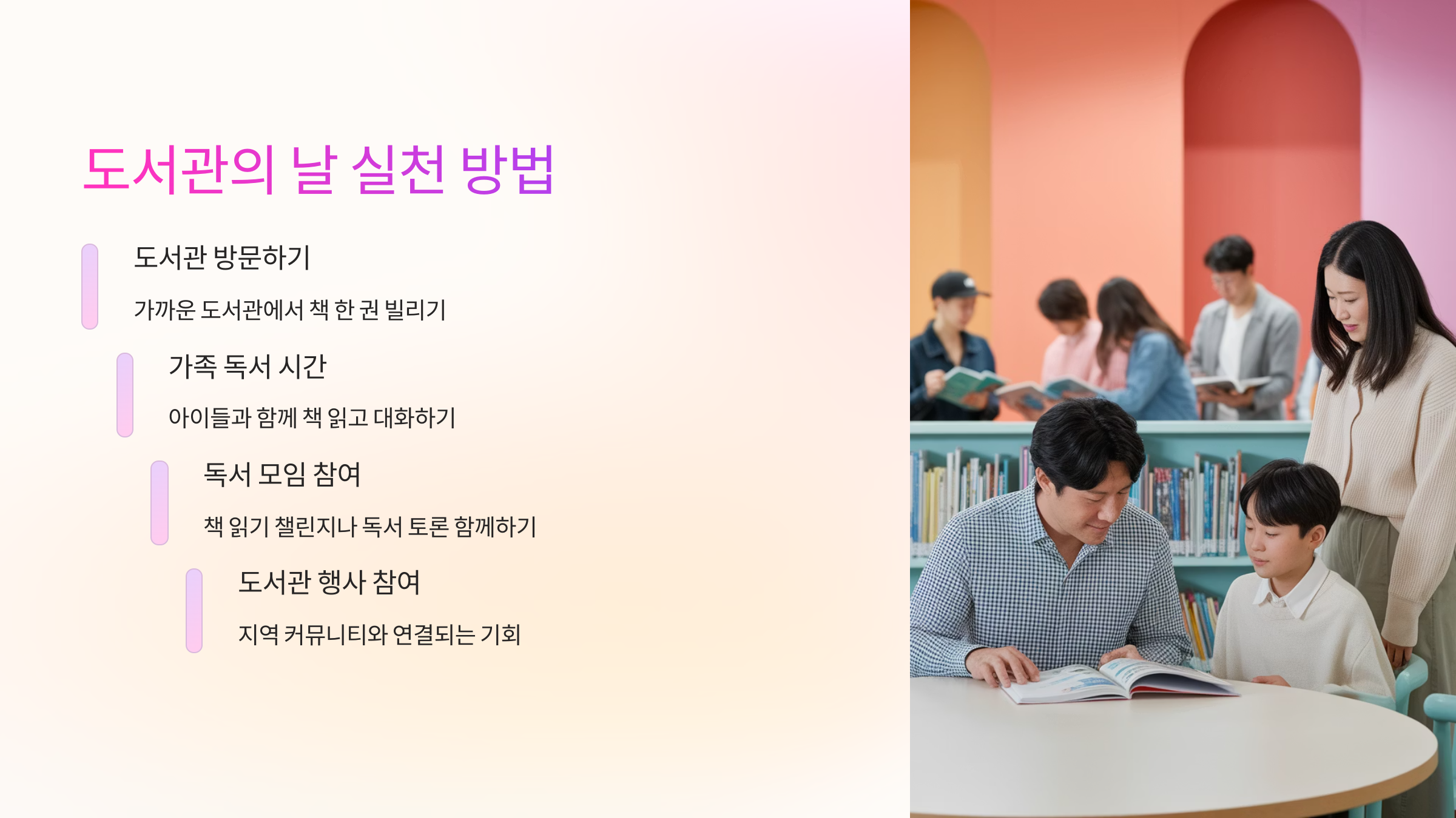 도서관의 날을 기념하여 우리가 실천할 수 있는 작은 변화는 다음과 같습니다:
